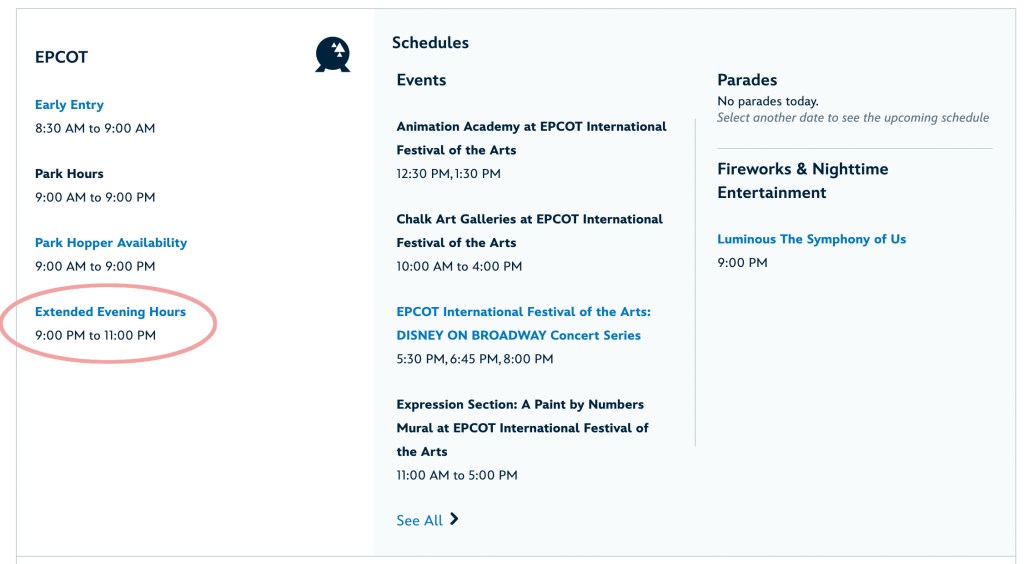 Check park hours on the Disney World website or app. Though they won’t be final at this point, you’ll see many special events in advance.