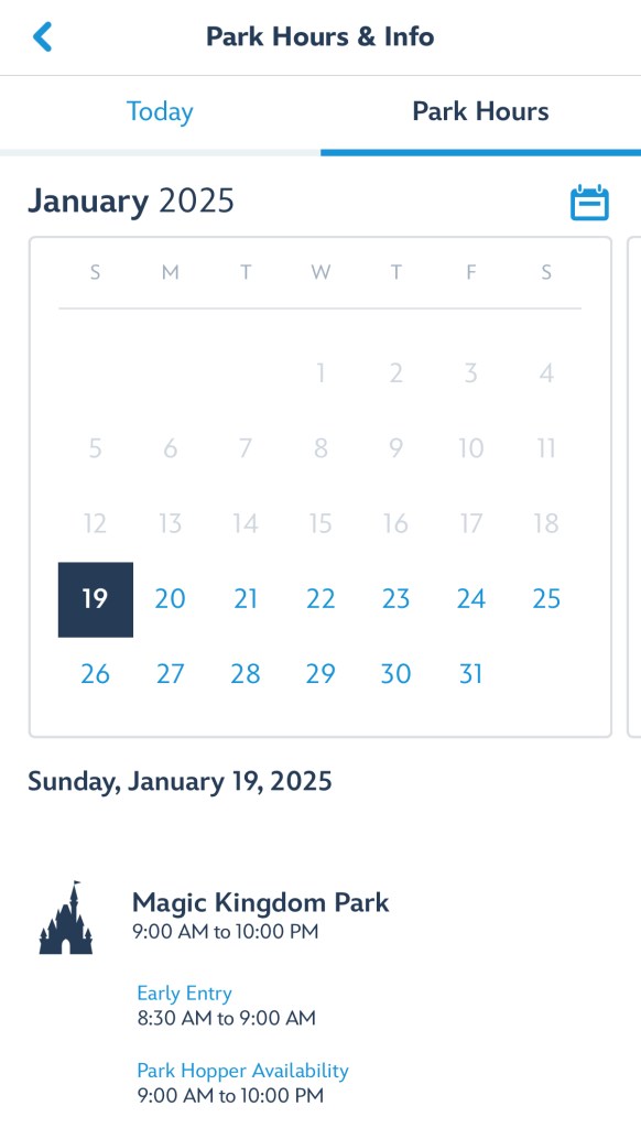 Confirm park hours for each day of your visit. These are finalized 2-3 weeks in advance.